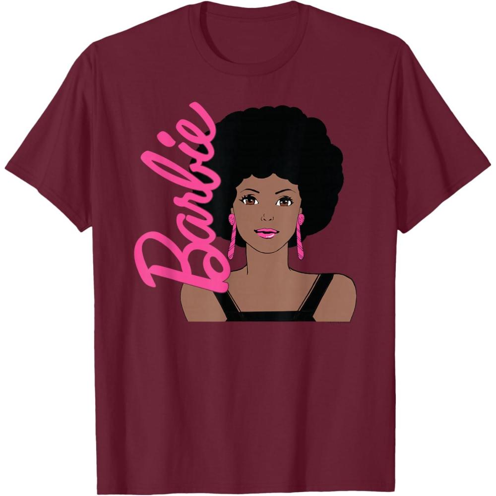 Afro Barbie Portrait design. This design celebrates Afro Barbie – in a bold, vibrant hot pink graphic, showcasing her natural beauty and empowering style. With striking colors and a modern, confident vibe, it’s the perfect choice for those who embrace individuality and want to add a touch of Barbie’s iconic charm and strength to their wardrobe.