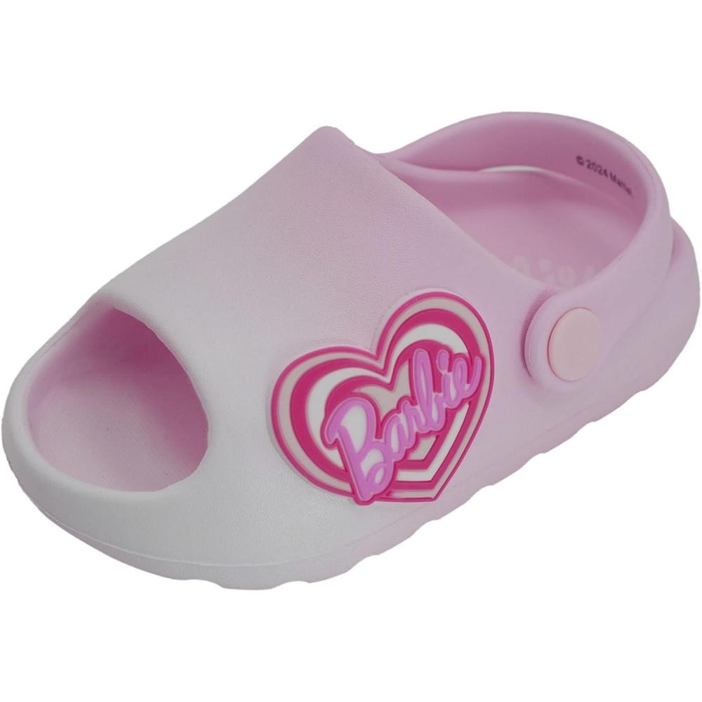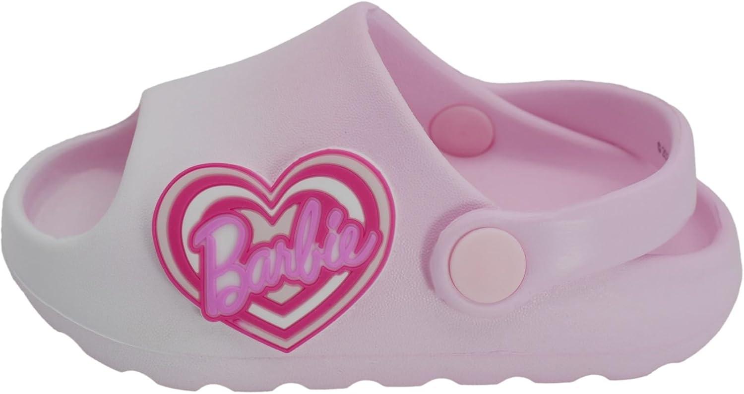 Step into comfort and style with these Barbie Toddler Girls' Cloud Slides! Designed in vibrant colors, these adorable slip-on sandals feature the iconic Barbie logo, making them a fun choice for any young Barbie fan. The strap easily rotates from the back to the front, allowing for a secure and customizable fit. With a soft, cushioned footbed, these slides ensure comfort for your toddler’s feet during all-day play. Perfect for summer fun, whether at the pool, beach, or playground, these durable yet lightweight slides are made for little feet to enjoy.