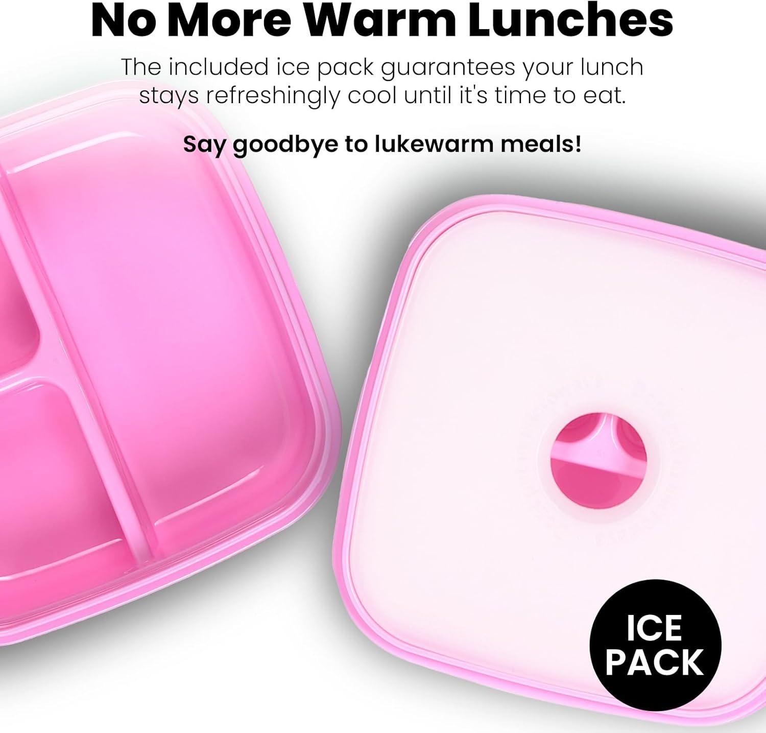 CONVENIENT FOOD STORAGE: This lunch box includes three compartments to easily organize lunch and snacks, an ice pack to keep food fresh and cold, and a leakproof lid to ensure food stays securely in place. Perfect for storing salads with dressing, pastas with sauces, chips with dip, toddler snacks, and so much more.