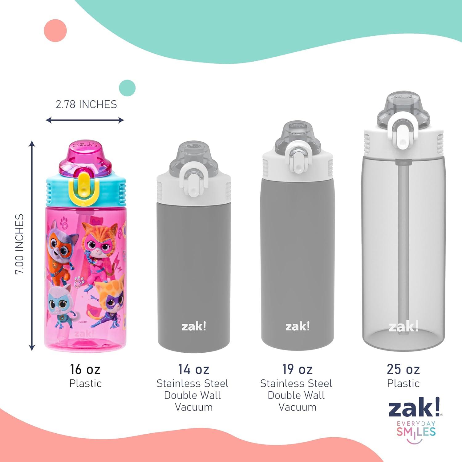 SIZE & MATERIAL: This Zak water bottle has a 16-ounce capacity, measuring 4.33 by 2.78 inches wide and 7 inches tall. It's made of durable, break-resistant, and BPA-free plastic, and recommended for children age 3 and up.
